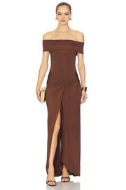 This evening dress features a sheath silhouette that elegantly contours the body. It has an off-shoulder neckline with a draped detail for a refined look, sleeveless design for a chic appearance, and a knot-accent with a high-slit for a tailored fit. The floor-length cut, crafted from a sleek fabric, is perfect for formal galas, red-carpet events, and upscale occasions, exuding a sense of captivating glamour.