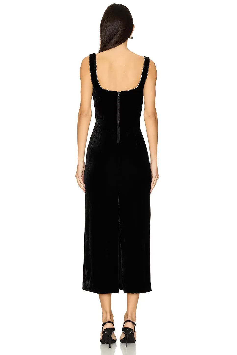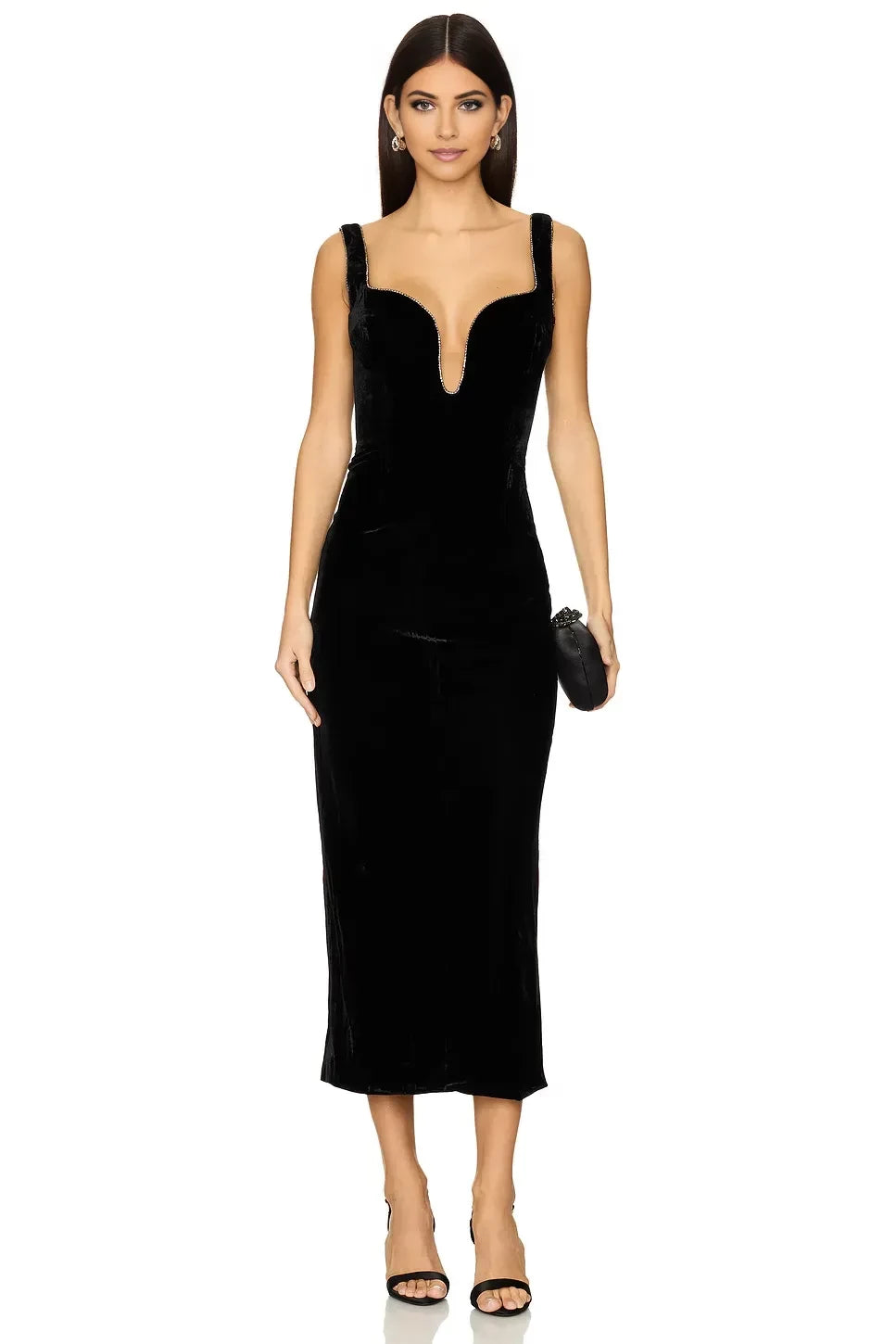 This evening dress features a sheath silhouette that hugs the body gracefully. It has a plunge neckline for a bold and alluring look, sleeveless design for a sleek appearance, and a zipper-back for easy wear. The midi length offers a perfect balance of sophistication and modernity, making it an excellent choice for formal parties, galas, and other upscale events, exuding a sense of luxurious charm.