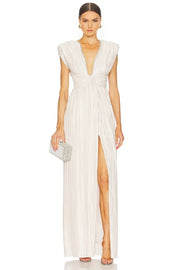 This evening dress features a sheath silhouette. It has a plunge V-neckline with cap sleeves. The embellished-back style adds a dazzling charm, and the floor-length cut is perfect for formal events. Pleated fabric and high-slit detail create a glamorous and sophisticated evening look.