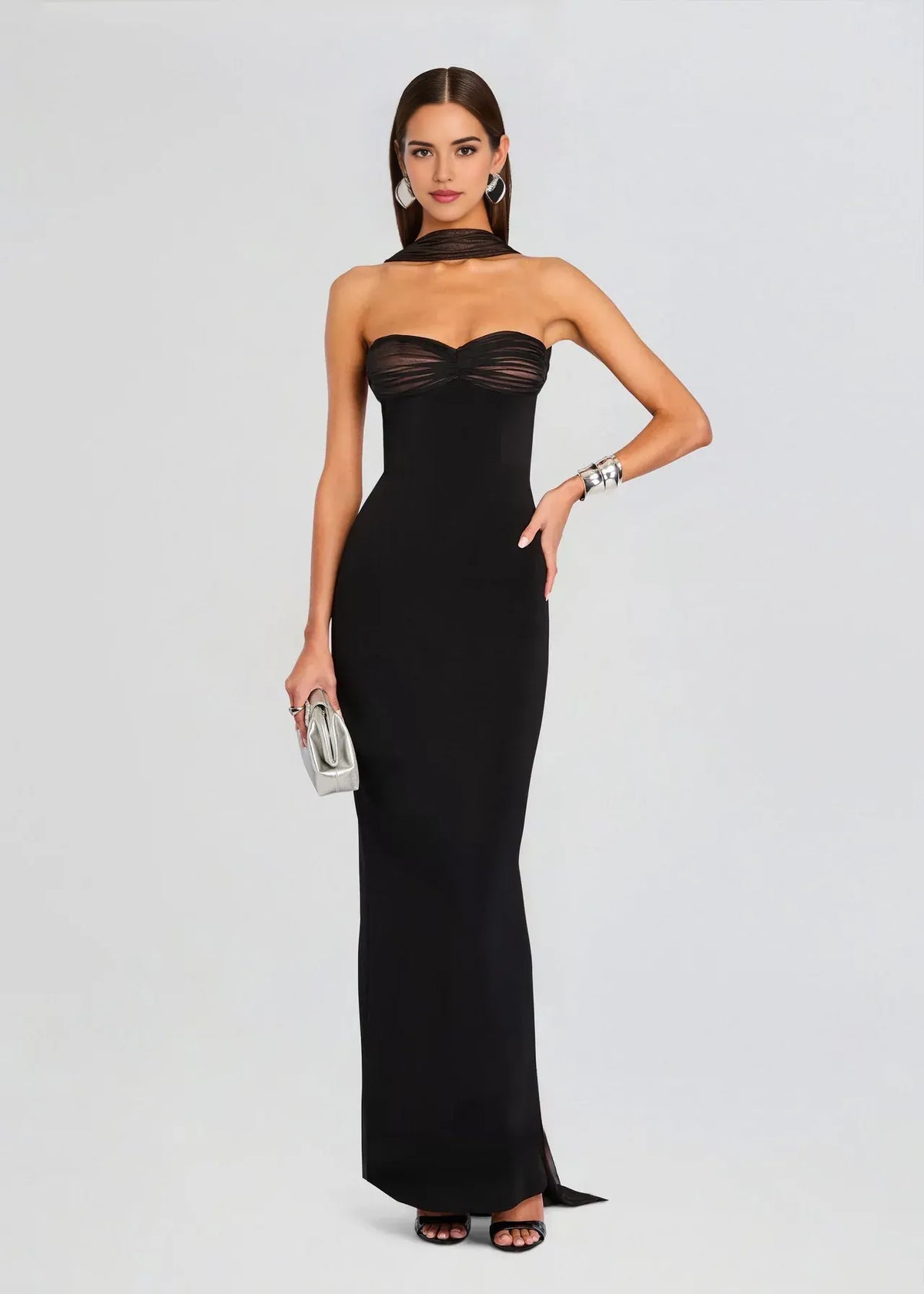 This evening dress features a sheath silhouette that offers a sleek and figure-hugging fit. The strapless design brings a glamorous and alluring touch, while the sleeveless style provides a chic and effortless look. The bow-back accents add elements of romantic charm, enhancing the dress’s overall appeal. With a floor-length design, it’s ideal for evening events, ensuring the wearer looks glamorous and confident.