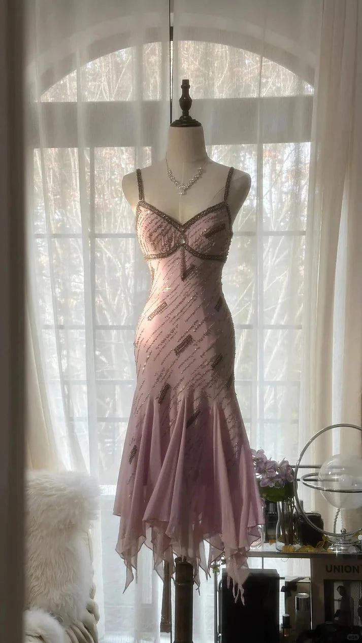 Elevate your special occasion with this stunning pink chiffon mermaid dress, featuring a sweetheart neckline adorned with delicate glittering beads. The spaghetti straps provide a graceful silhouette while the mermaid cut enhances your curves for an elegant fit. Perfect for prom, cocktail parties, homecoming, or evening events, this dress combines sophistication and sparkle to ensure you stand out with confidence and style.