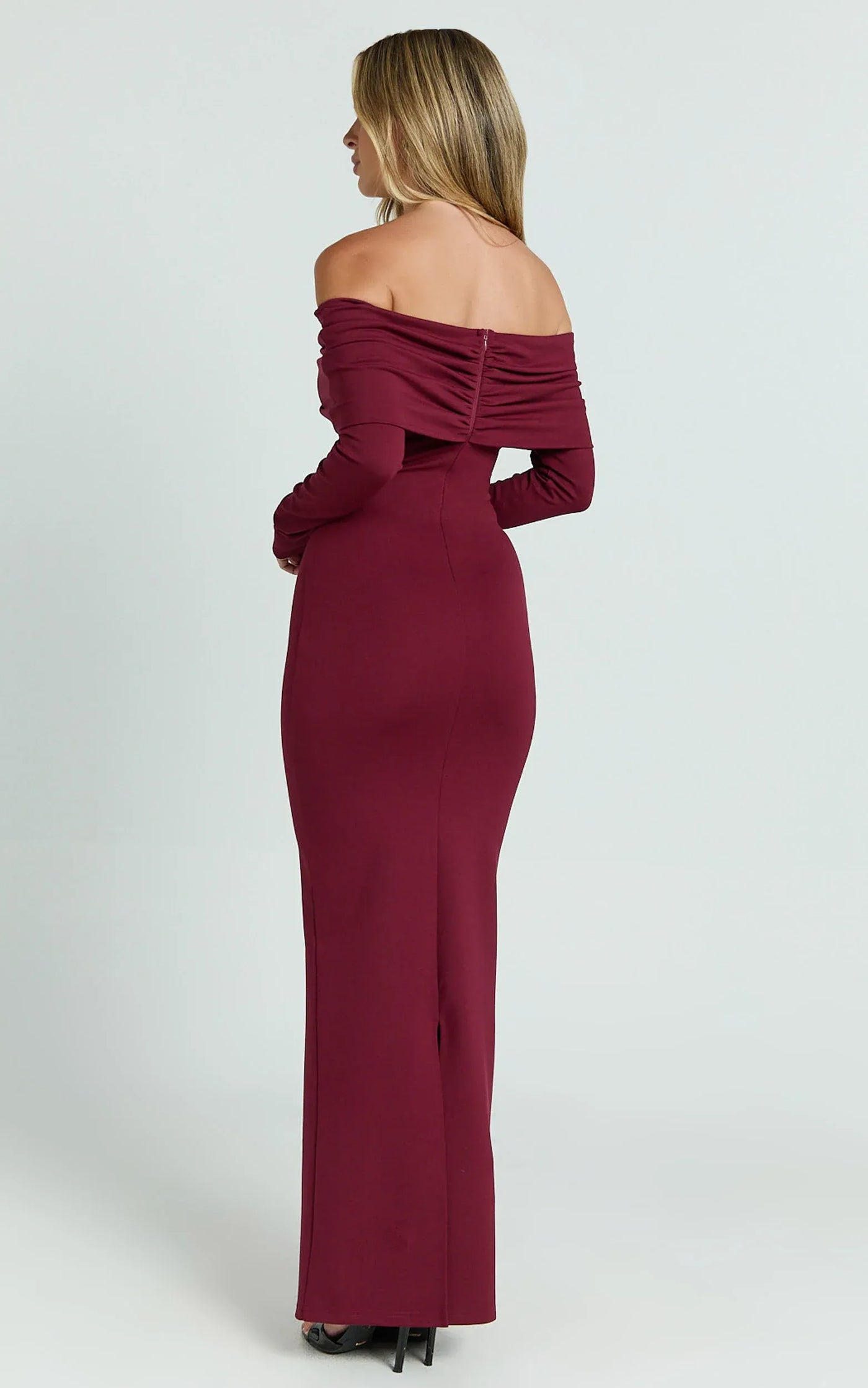 This evening dress features a sheath silhouette. It has an off-shoulder neckline with long sleeves. The ruched-back detail, floor-length cut, and plus-size option bring gorgeous charm, making it ideal for evening events. The draped bodice and figure-hugging design create a captivating and elegant evening look.