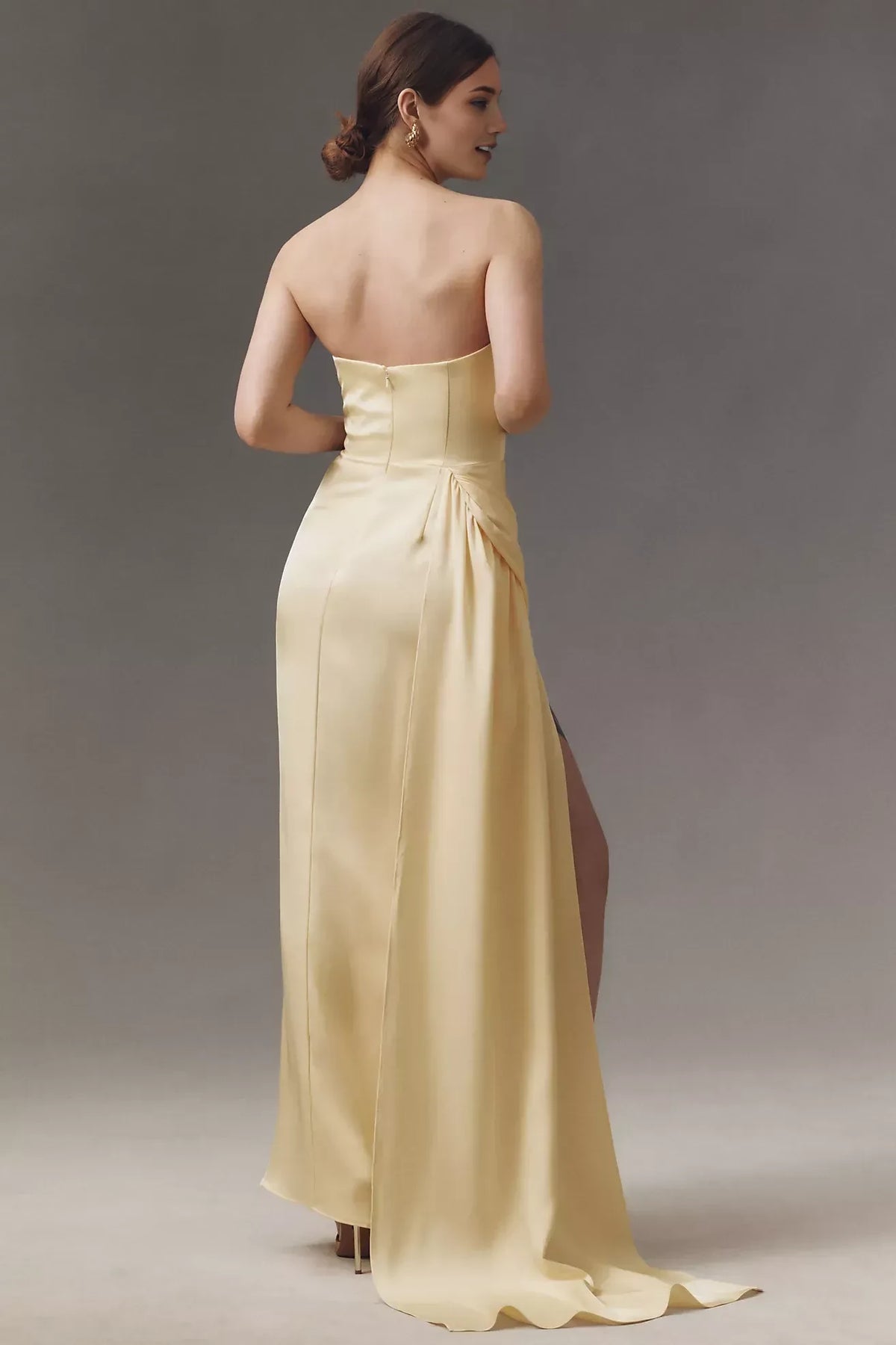 This gorgeous dress features a sheath silhouette, offering a sleek and body hugging look. The strapless neckline exudes alluring charm, while the sleeveless design adds a touch of modern simplicity. The zipper back ensures a secure fit, and the floor length skirt with a dramatic slit creates a truly gorgeous and unforgettable style, perfect for evening events.