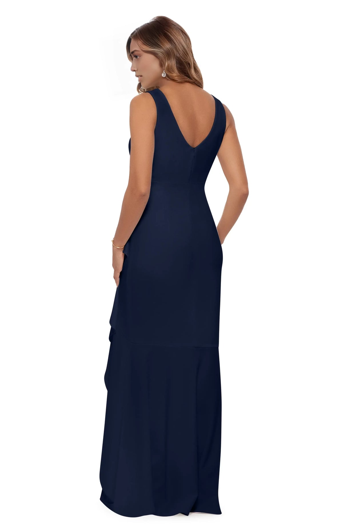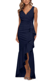 This graceful dress features a mermaid silhouette, hugging the body to highlight curves and flaring out at the bottom for a dramatic effect. The V neck design brings a classic and alluring charm. With a sleeveless cut, it adds a touch of elegance. The V back detail creates a sleek and stylish look, and the floor length skirt, along with the ruffle and side slit, makes for a truly graceful and unforgettable appearance, perfect for evening events.