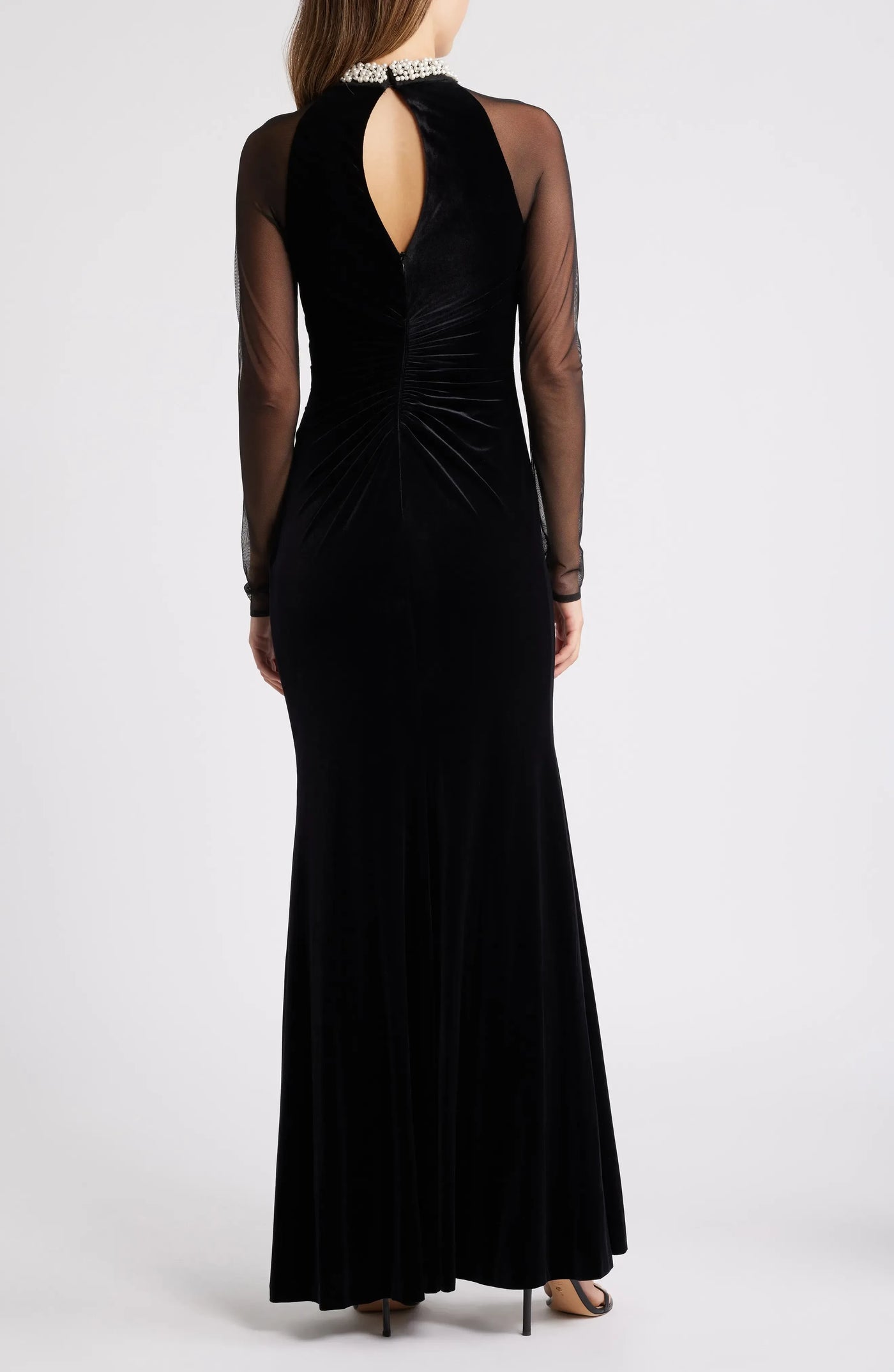 This luxurious dress features a mermaid silhouette, hugging the body to highlight curves and flaring out at the bottom for a dramatic effect. The high neck design brings a refined and elegant charm. With sheer long sleeves, it adds a touch of sophistication. The keyhole back detail creates a stylish and alluring look, and the floor length skirt makes for a truly luxurious and unforgettable appearance, perfect for evening events.