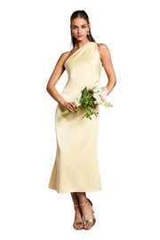This graceful dress features a sheath silhouette, hugging the body gracefully for a poised and elegant look. The one shoulder design adds a touch of unique allure. With a sleeveless cut, it keeps a sleek and modern style. The ruched back detail ensures a lovely and seamless fit, and the midi length skirt makes for a truly graceful and unforgettable appearance, perfect for evening events.