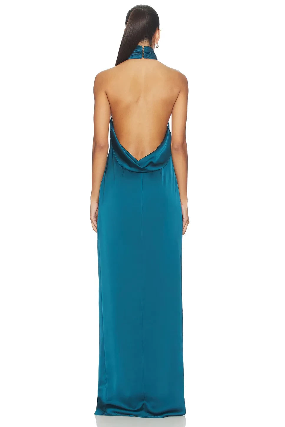 This evening dress features a sheath silhouette that elegantly contours the body. It has a halter neckline with a gathered detail for a refined look, sleeveless design for a chic appearance, and a draped-back with a low-cut cutout for a tailored fit. The floor-length cut, crafted from lustrous satin fabric, is perfect for formal galas, red-carpet events, and upscale occasions, exuding a sense of opulent luxury.