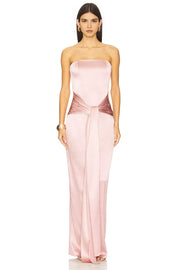 This evening dress features a sheath silhouette. It has a strapless neckline with a sleeveless design. The draped-waist style adds a sumptuous charm, and the floor-length cut is perfect for formal events. Satin fabric and elegant details create an opulent and sophisticated evening look.
