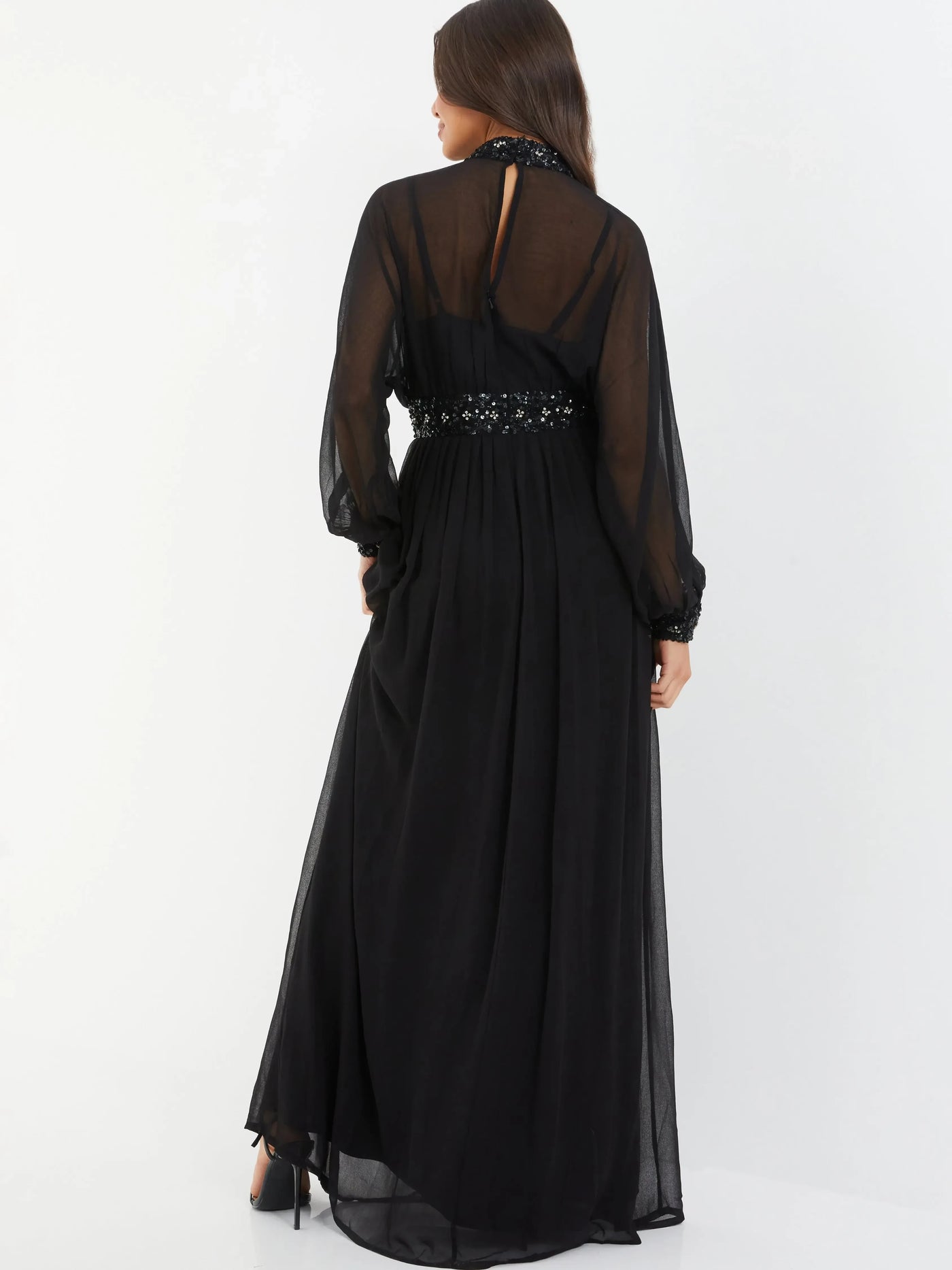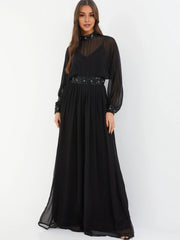 This luxurious dress features an A line silhouette, flowing gracefully from the waist for a flattering and refined look. The high neck design adds a touch of elegant charm. With long sleeves, it offers both style and coverage. The embellished back detail creates a sparkling and eye catching look, and the floor length skirt makes for a truly luxurious and unforgettable appearance, perfect for evening events.