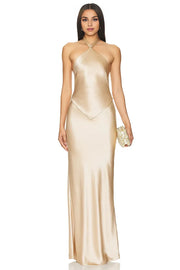This evening dress features a sheath silhouette that elegantly flatters the figure. It has a halter neckline with a chic crisscross detail for a sophisticated look, sleeveless design for a sleek appearance, and a tie-back with a stylish knot that adds a touch of allure. The floor-length cut flows gracefully, making it a perfect choice for formal galas, red-carpet events, and other upscale occasions, exuding a sense of opulent charm.