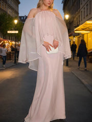 This off-the-shoulder evening dress features long sleeves and a mermaid silhouette, crafted from lightweight chiffon for graceful movement. Its floor-length design is enhanced by delicate pleating, creating an elegant and refined look ideal for formal occasions. The combination of structured fit and flowing fabric offers both sophistication and comfort throughout your event.
