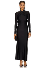 This evening dress features a sheath silhouette. It has a mock neckline with long sleeves. The floral cutout-back design adds a lavish charm, and the floor-length cut is perfect for formal events. The draped front and sculpted floral details create a luxurious and unforgettable evening look.