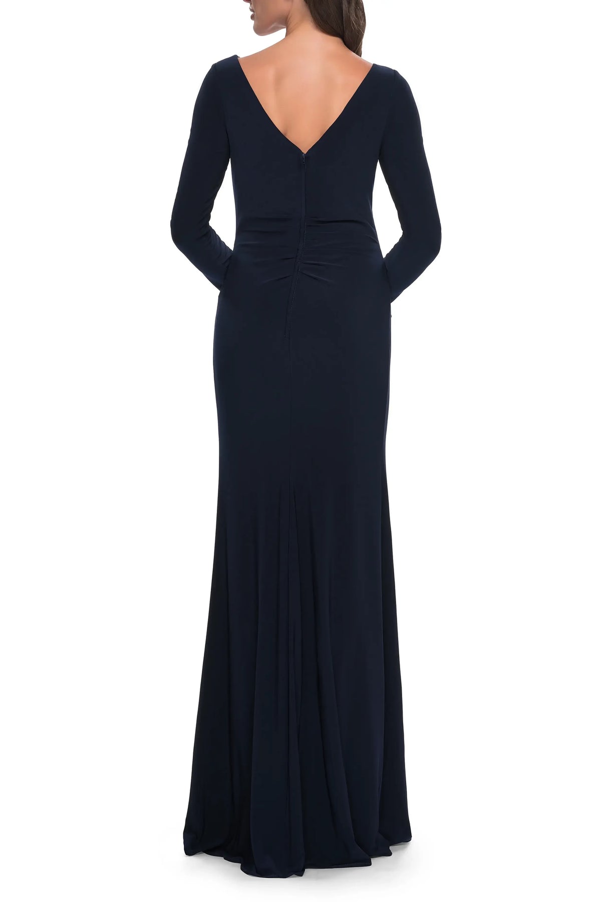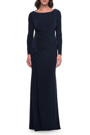 This polished dress features a sheath silhouette, hugging the body gracefully for a sleek and sophisticated look. The boat neck design adds a touch of elegant allure. With long sleeves, it offers warmth and style. The V back detail ensures a lovely and seamless fit, and the floor length skirt makes for a truly polished and unforgettable appearance, perfect for evening events.