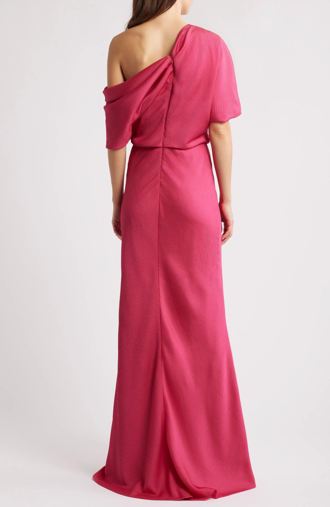 This polished dress features a sheath silhouette, hugging the body gracefully for a sleek and charming look. The one shoulder design adds a touch of elegant uniqueness. With short sleeves, it offers a refined and stylish appearance. The draped back detail ensures a flowing and seamless fit, and the floor length skirt, with a smooth finish, makes for a truly polished and unforgettable appearance, perfect for evening events.