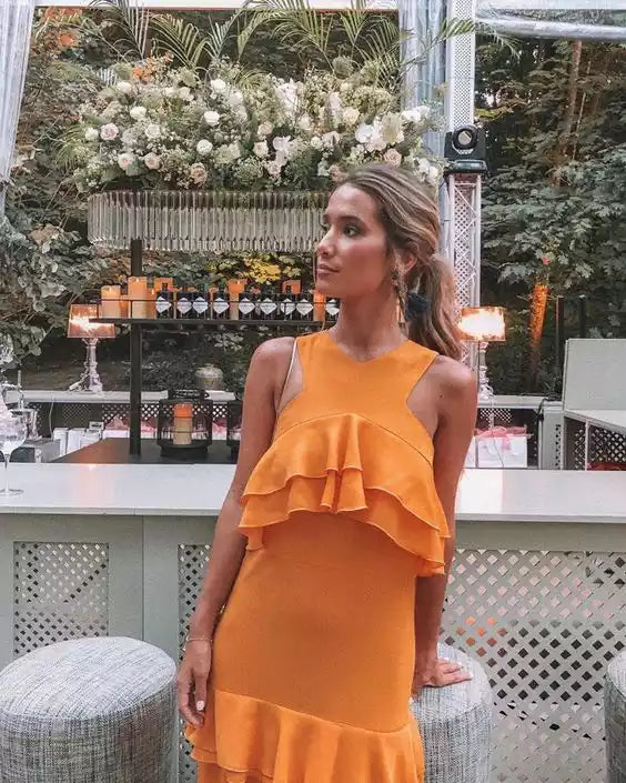 This floor-length sleeveless prom dress features a modern tiered design, combining elegance with contemporary style. Crafted to enhance your silhouette, it offers a graceful flow ideal for formal occasions. Its sleeveless cut ensures comfort and freedom of movement, making it a sophisticated choice for evening events.