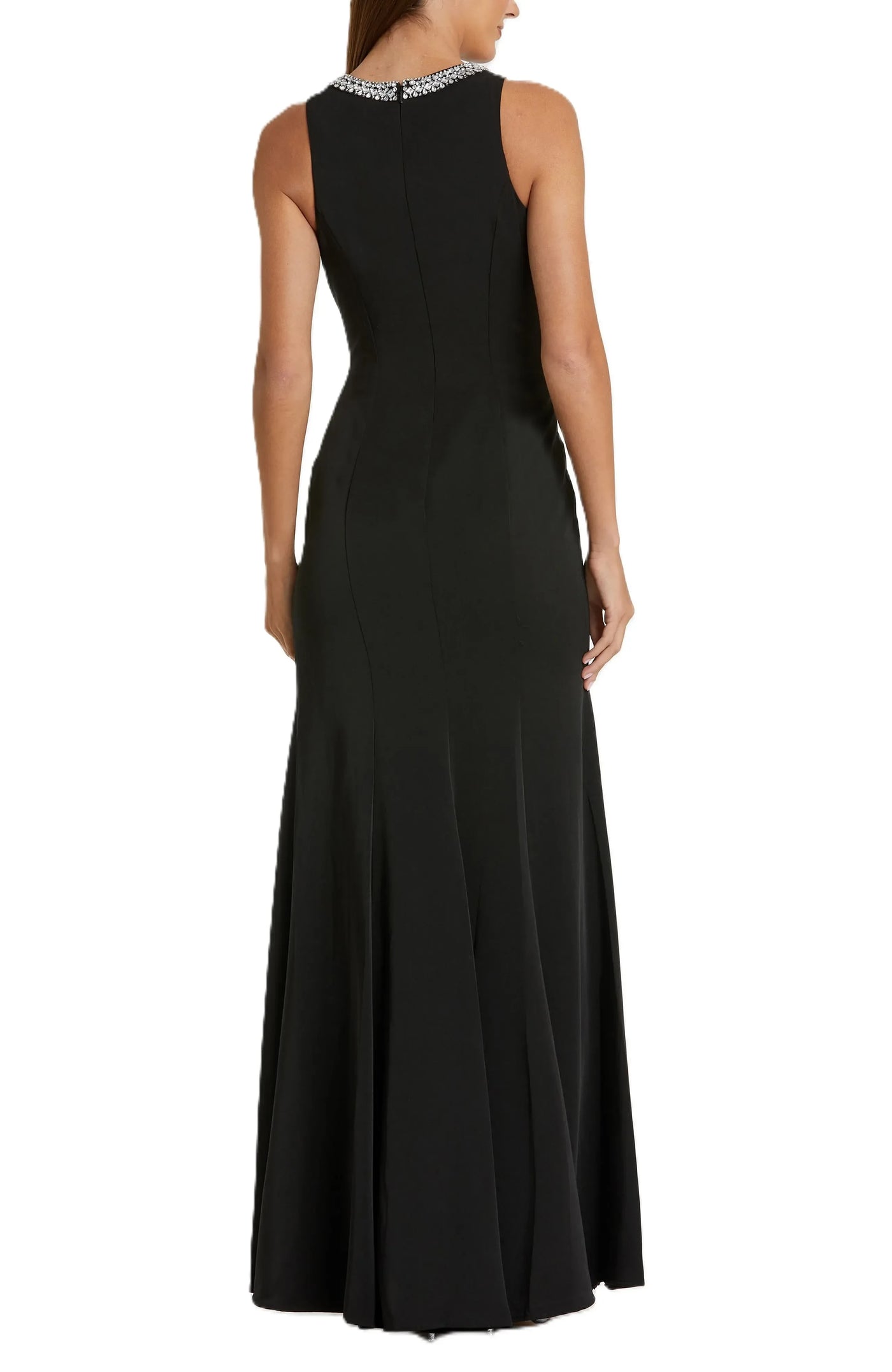 This radiant dress features a mermaid silhouette, hugging the body to highlight curves and flaring out at the bottom for a dramatic effect. The jewel neck design, adorned with sparkling details, brings a luxurious and eye catching charm. With a sleeveless cut, it adds a touch of allure. The plain back detail keeps it sleek, and the floor length skirt makes for a truly radiant and unforgettable appearance, perfect for evening events.