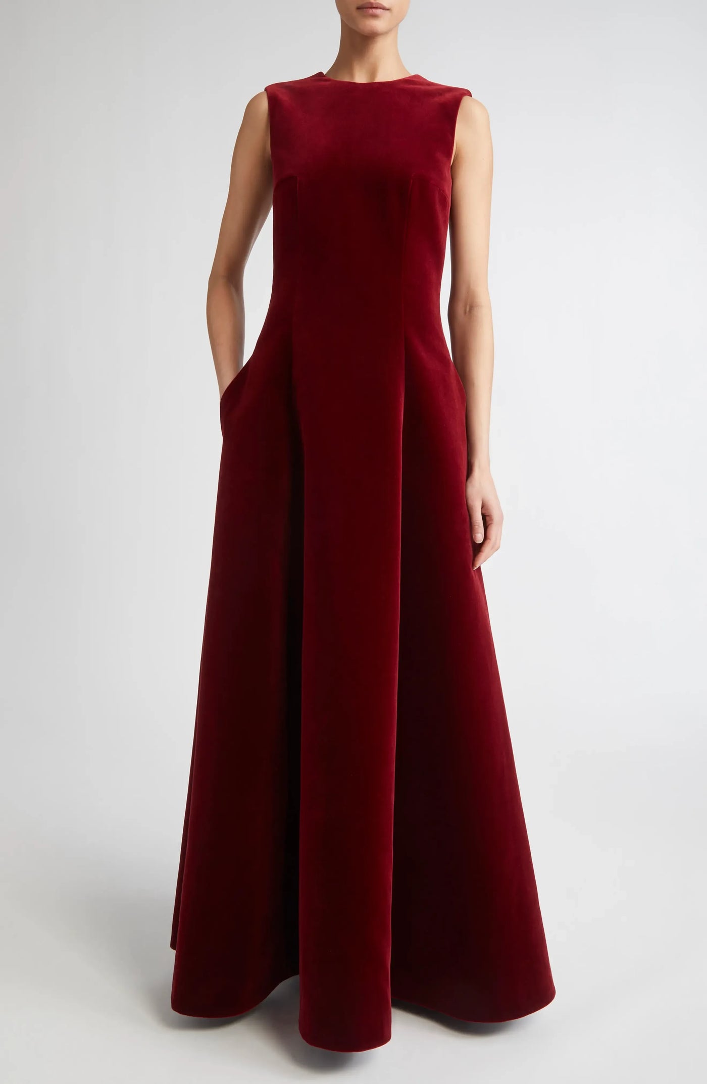 This refined dress features an A line silhouette, flowing gracefully to flatter your figure for a polished and sophisticated look. The crew neck design adds a touch of classic allure. With a sleeveless cut, it keeps a sleek and modern style. The open back detail ensures a lovely and seamless fit, and the floor length skirt makes for a truly refined and unforgettable appearance, perfect for evening events.