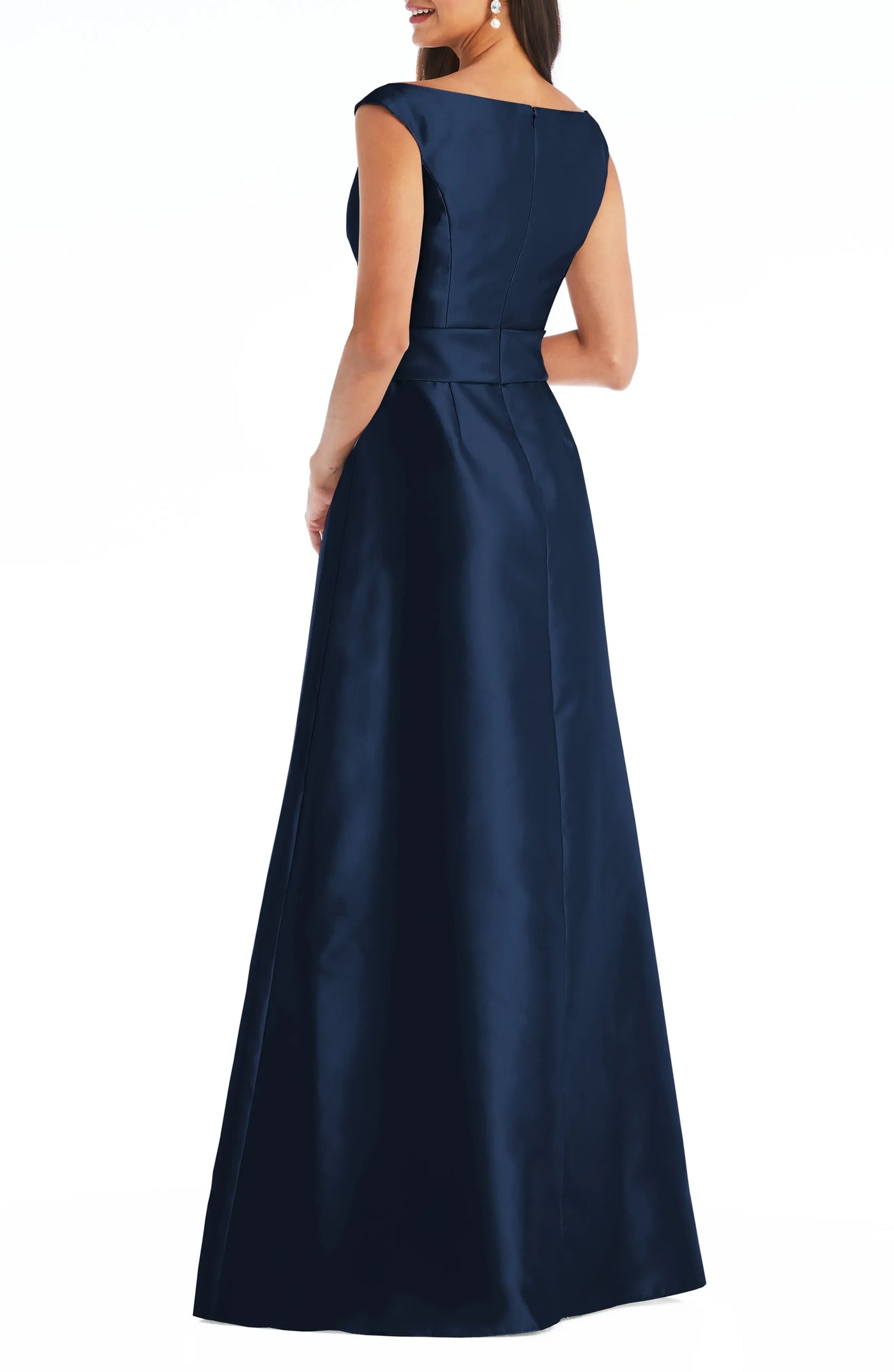 This refined dress features an A line silhouette, offering a flowing and comfortable fit. The V neck design brings a classic and alluring charm. With cap sleeves, it adds a touch of elegance. The zipper back detail ensures a secure and sleek fit, and the floor length skirt makes for a truly refined and unforgettable appearance, perfect for evening events.