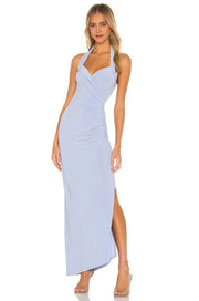This dress features a refined sheath silhouette with a halter neck, sleeveless style, an open-back, a high-slit, and a floor-length cut that offer a sophisticated and fashionable look. It’s perfect for evening events, ensuring you look stylish and confident.