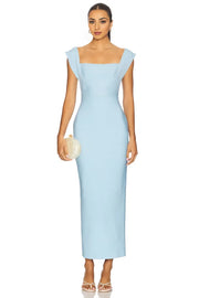 This evening dress features a sheath silhouette that elegantly contours the body. It has a square neckline with structured detailing for a refined look, cap sleeves for a chic appearance, and a low-back with a zipper closure for a tailored fit. The midi-length cut, crafted from a bandage-style fabric, is perfect for cocktail parties, formal dinners, and upscale occasions, exuding a sense of understated sophistication.