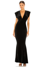 This evening dress features a sheath silhouette. It has a plunge neckline with cap sleeves. The ruched-back style adds a stately charm, and the floor-length cut is perfect for formal events. Velvet fabric and mermaid fit create a majestic and sophisticated evening look.