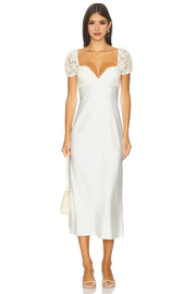 This evening dress features a sheath silhouette that elegantly contours the body. It has a sweetheart neckline with lace detailing for a refined look, cap sleeves with lace accents for a chic appearance, and an open-back with lace cutout for a tailored fit. The midi-length cut, crafted from a satin-lace combo fabric, is perfect for cocktail parties, formal dinners, and upscale occasions, exuding a sense of dreamy romance.