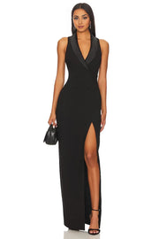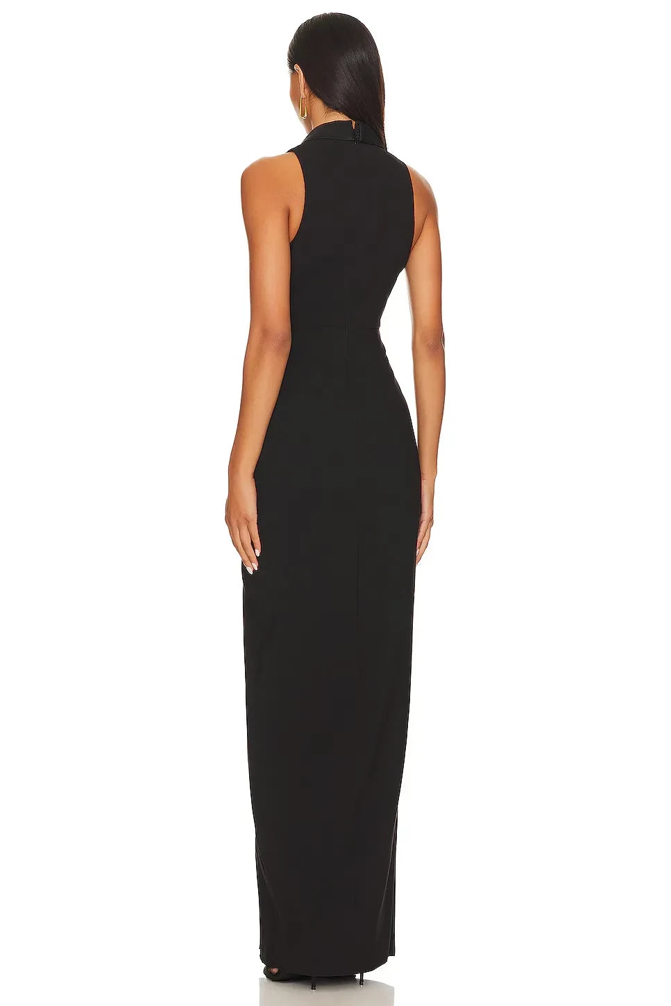 This evening dress features a sheath silhouette that elegantly contours the body. It has a shawl collar with a tailored detail for a refined look, sleeveless design for a chic appearance, and a high-slit with a button-accented front for a tailored fit. The floor-length cut, crafted from a structured fabric, is perfect for formal galas, red-carpet events, and upscale occasions, exuding a sense of crisp sophistication.
