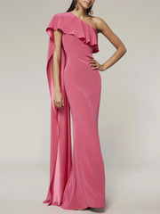 Sheath One-Shoulder Sleeveless Floor-Length Watteau Train Prom Dress Evening Dress