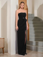 This elegant sheath evening dress features a strapless, sleeveless design that highlights the shoulders and neckline. Its floor-length silhouette offers a timeless look, while the side split adds a touch of allure and ease of movement. A tasteful bowknot detail enhances the waist, providing a refined and sophisticated finish perfect for prom or formal occasions. Crafted in classic black, this dress combines simplicity with subtle accents to create a striking and confident appearance.