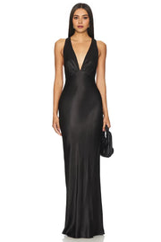 This dress features a sleek sheath silhouette with a plunging V-neck, sleeveless style, crisscross back detailing, and a floor-length cut that offer a sophisticated and fashionable look. It’s perfect for evening events, ensuring you look stylish and confident.