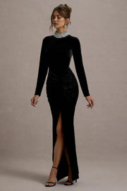 This dress features a sophisticated mermaid silhouette with a high neck, long sleeves, and a zip-back that offer a refined and stylish look. The floor-length cut adds a touch of elegance, making it perfect for evening events, ensuring you look stylish and confident.