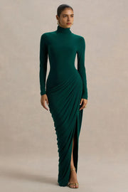 This dress features a sophisticated sheath silhouette with a turtleneck, long sleeves, and a zipper-back that offer a refined and fashionable look. The floor-length cut adds a touch of elegance, making it perfect for evening events, ensuring you look stylish and confident.