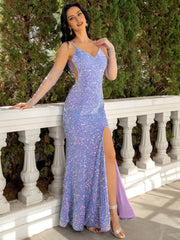 This elegant one-shoulder evening dress features a sleeveless design and a flattering mermaid silhouette that gracefully hugs the body. Crafted with shimmering sequins, it adds a touch of glamour, while the floor-length cut and side slit enhance movement and sophistication. Ideal for formal occasions, this dress combines style and comfort for a confident, standout look.