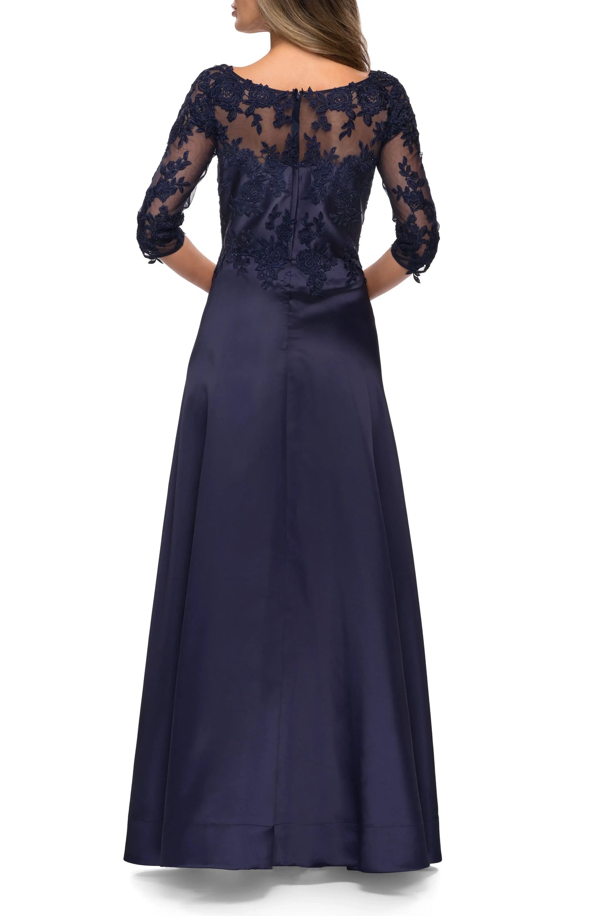 This splendid dress features an A line silhouette, flowing gracefully from the waist for a flattering and refined look. The scoop neck design brings a touch of classic charm. With three quarter sleeves, it offers a balance of style and coverage. The lace back detail creates a delicate and captivating look, and the floor length skirt makes for a truly splendid and unforgettable appearance, perfect for evening events.