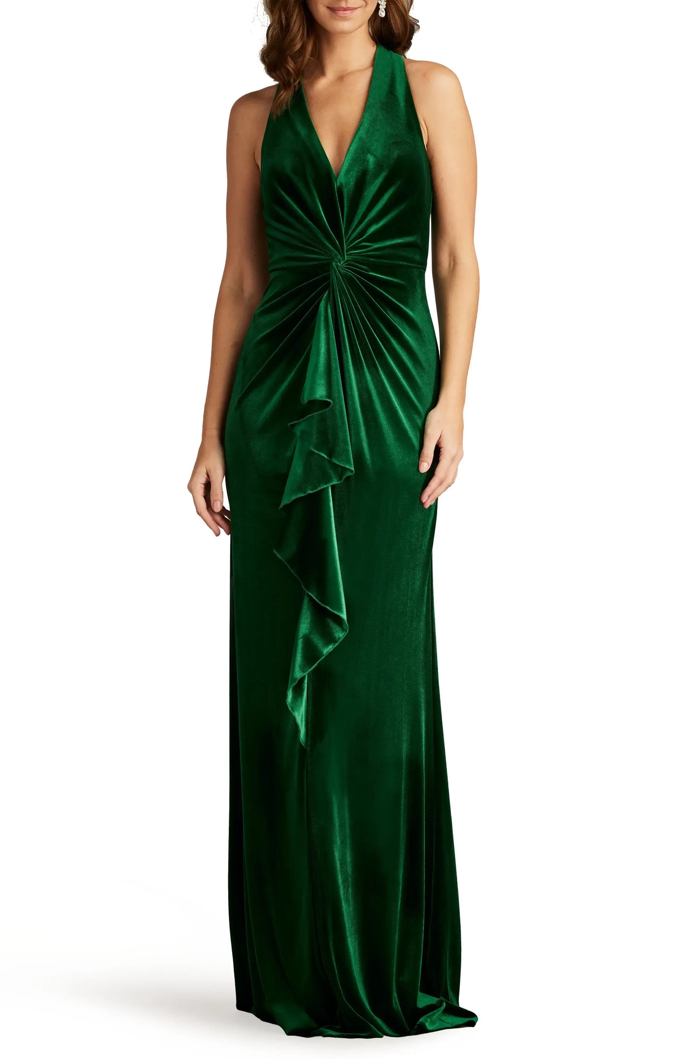 This splendid dress features a mermaid silhouette, hugging the body gracefully and flaring at the bottom for a show stopping and charming look. The halter and plunging V neck design adds a touch of bold allure. With a sleeveless cut, it keeps you cool and stylish. The zipper back detail ensures a secure and seamless fit, and the floor - length skirt makes for a truly splendid and unforgettable appearance, perfect for evening events.