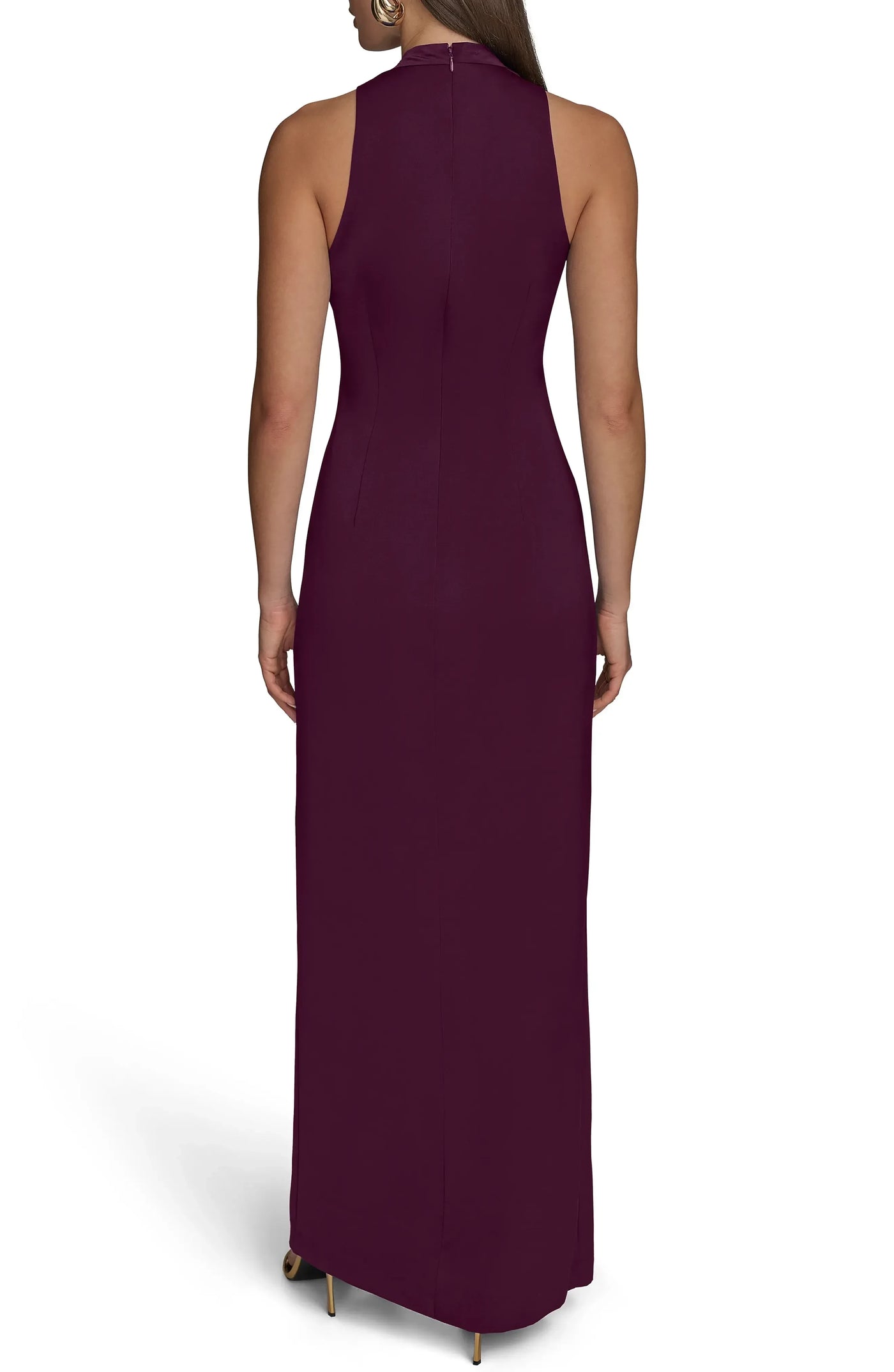 This striking dress features a sheath silhouette, hugging the body to highlight curves. The halter neck design brings a bold and stylish charm. With a sleeveless cut, it adds a touch of allure. The zipper back detail ensures a secure and sleek fit, and the floor length skirt, along with the front slit, makes for a truly striking and unforgettable appearance, perfect for evening events.