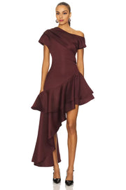 This evening dress features a sheath silhouette. It has a one-shoulder neckline with short sleeves. The zipper-back style adds a bold charm, and the high-low cut is perfect for semi-formal events. Ruffled details and an asymmetric design create a distinctive and sophisticated evening look.