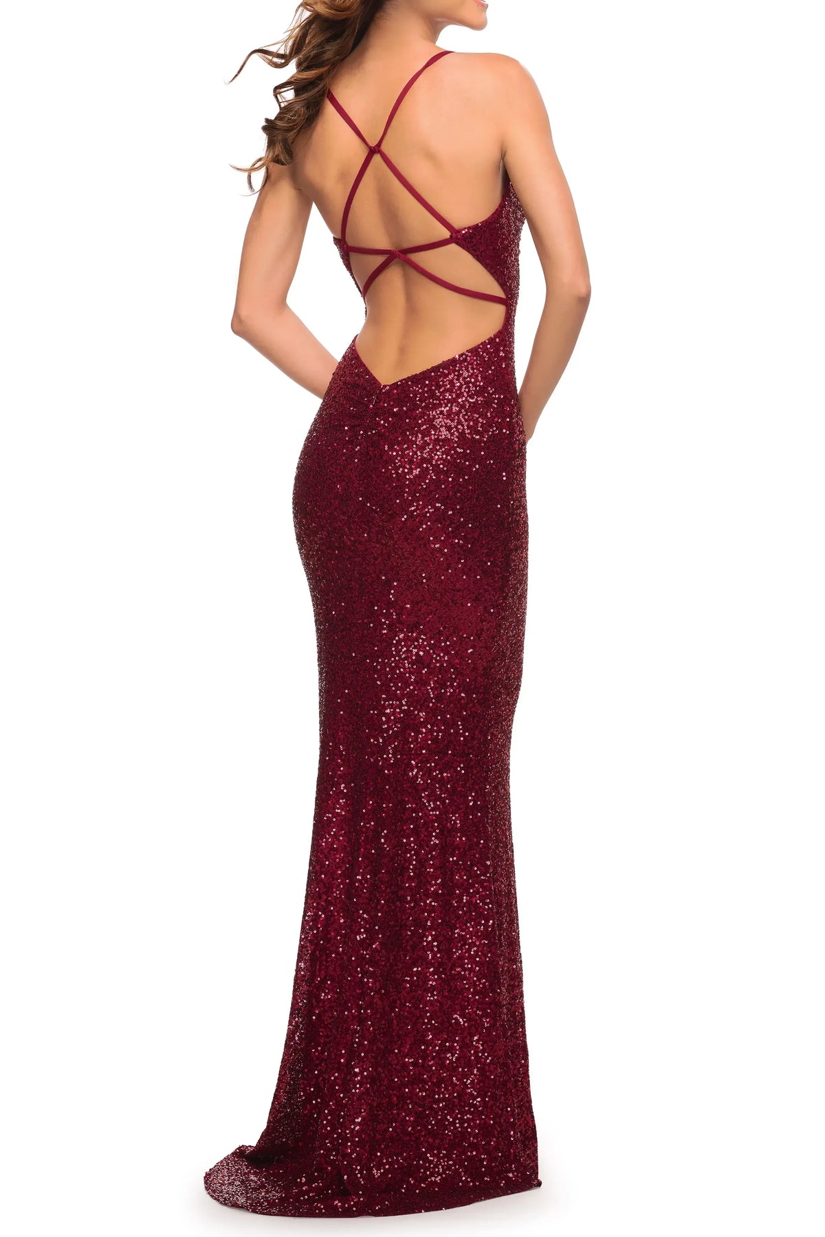 This striking dress features a sheath silhouette, hugging the body gracefully for a bold and captivating look. The V neck design adds a touch of alluring charm. With a sleeveless cut, it keeps you cool and stylish. The strappy back detail ensures a unique and seamless fit, and the floor length skirt, adorned with shimmering sequins, makes for a truly striking and unforgettable appearance, perfect for evening events.