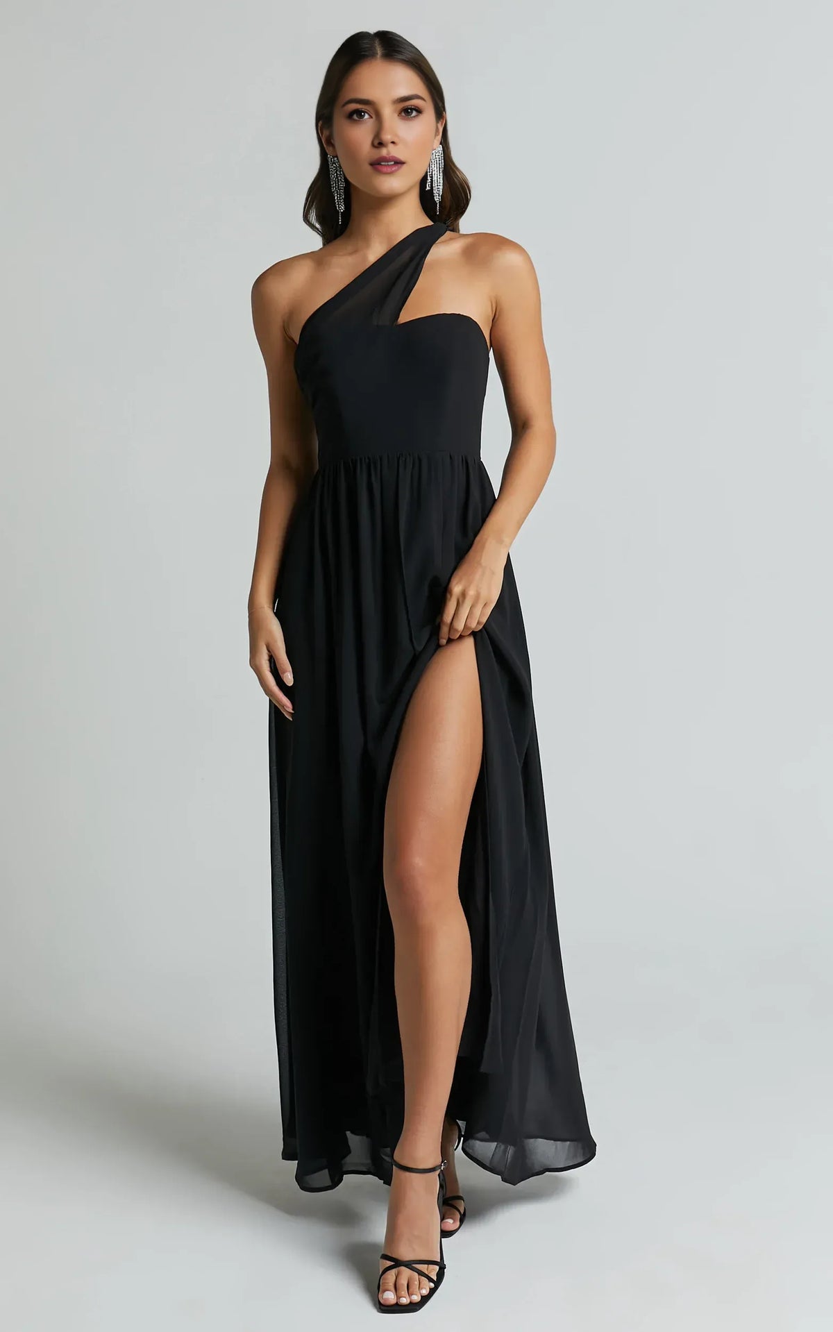 This evening dress features an A-line silhouette. It has a one-shoulder neckline with sleeveless design. The open-back detail, floor-length cut with high slit, and plus-size option bring stunning charm, making it ideal for evening events. The flowing skirt and asymmetric strap create a captivating and modern evening look.