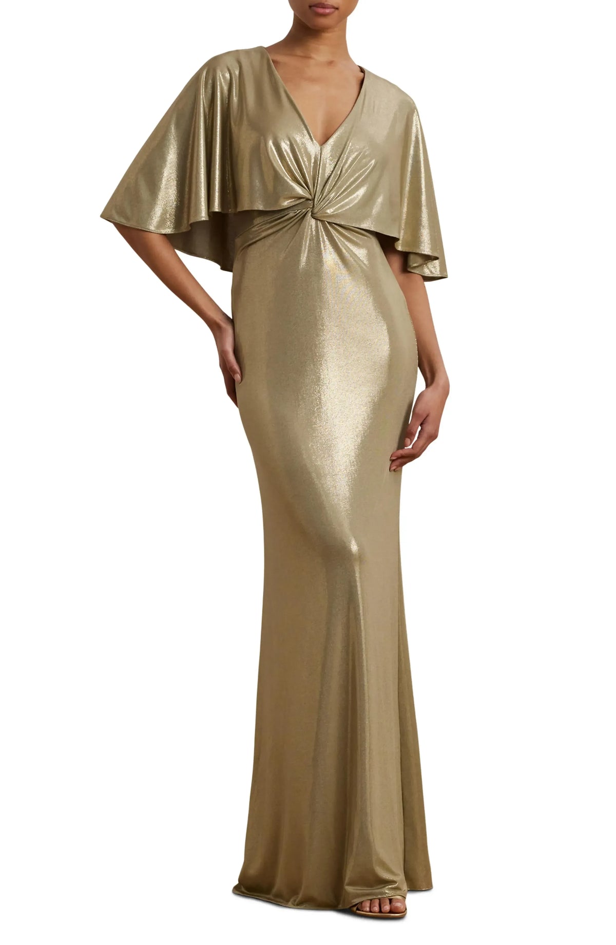 This stunning dress features a mermaid silhouette, hugging the body gracefully and flaring at the bottom for a show stopping and charming look. The V neck design adds a touch of bold allure. With cape sleeves, it offers a stylish and dramatic flair. The zipper back detail ensures a secure and seamless fit, and the floor length skirt makes for a truly stunning and unforgettable appearance, perfect for evening events.