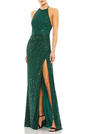 This stunning dress features a sheath silhouette, hugging the body gracefully for a striking and charming look. The halter neck design adds a touch of bold allure. With a sleeveless cut, it keeps you cool and stylish. The open back detail ensures a lovely and seamless fit, and the floor length skirt makes for a truly stunning and unforgettable appearance, perfect for evening events.