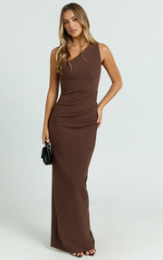 This evening dress features a mermaid silhouette that offers a sleek and figure-hugging fit. The one-shoulder neck design brings a modern and stylish touch, while the sleeveless style provides a chic and effortless look. The ruched-back accents add elements of alluring charm, enhancing the dress’s overall appeal. With a floor-length design, it’s ideal for evening events, ensuring the wearer looks stylish and confident.