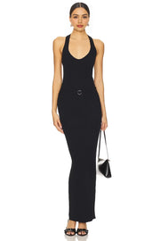 This evening dress features a sheath silhouette that elegantly contours the body. It has a halter neckline with a sleek design for a refined look, sleeveless style for a chic appearance, and a tie-back detail that adds a touch of allure. The floor-length cut flows gracefully, making it perfect for formal galas, red-carpet events, and upscale occasions, exuding a sense of sophisticated style.