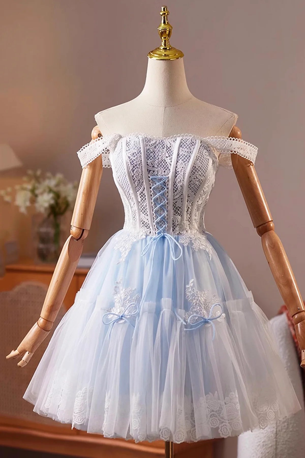 Blue Tulle Lace Short Prom Dress Knee length Lovely A-Line Homecoming Party Dress
