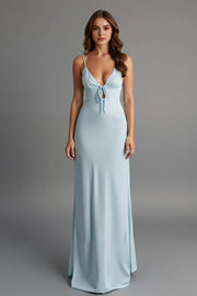 Step into charm with this sheath dress. It features a deep V neck for an alluring look, delicate spaghetti straps for a feminine touch, and a tie back that adds a sweet detail. The maxi length makes it perfect for evening occasions, ensuring you look graceful and captivating.