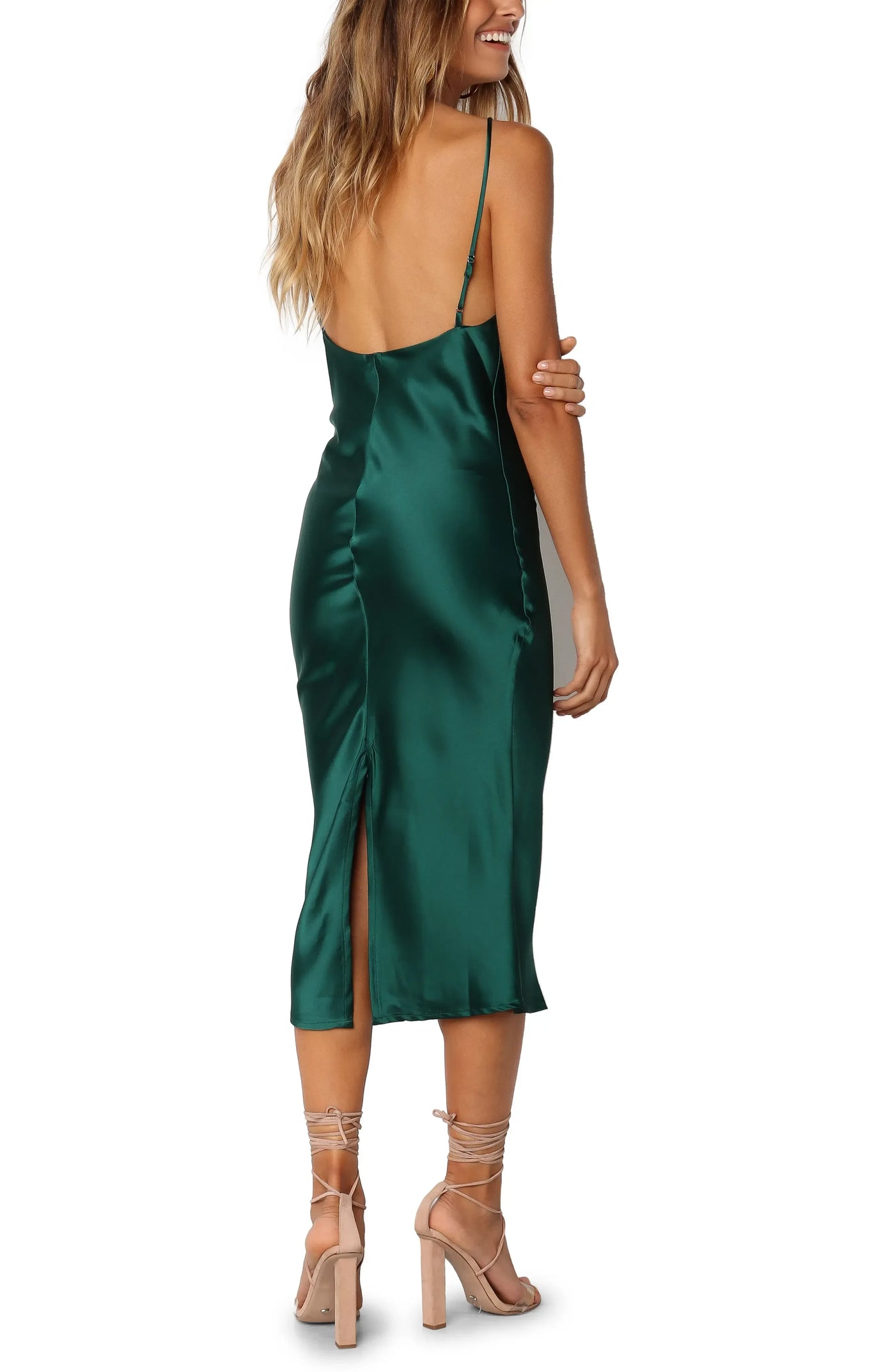This homecoming dress features a dramatic sheath silhouette that fits closely to the body. It comes with a cowl neckline and spaghetti straps, highlighting the elegant collarbone and shoulder lines. The low-back design adds a stylish detail, while the midi length with side slit brings a sophisticated and confident vibe. It's an excellent choice for homecoming events, allowing you to showcase a standout and elegant look effortlessly.