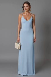 Step into elegance with this sheath dress. It features a deep V neck for a sophisticated and alluring look, delicate spaghetti straps for a feminine touch, and an open back that adds a touch of charm. The maxi length makes it perfect for evening occasions, ensuring you look graceful and stylish.