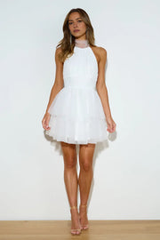 This dress is elegant and dreamy. Made of tulle, it has a light and airy feel. The halter neck design adds a touch of sophistication, highlighting the neck and shoulders. Being sleeveless, it's perfect for warm events and allows for easy movement. The back features a lovely bow, adding a charming detail that makes the dress stand out. As a mini dress with a tiered tulle skirt, it's ideal for parties, giving you a whimsical and stylish look. Whether it's a cocktail party or a special celebration, this dress will make you shine.