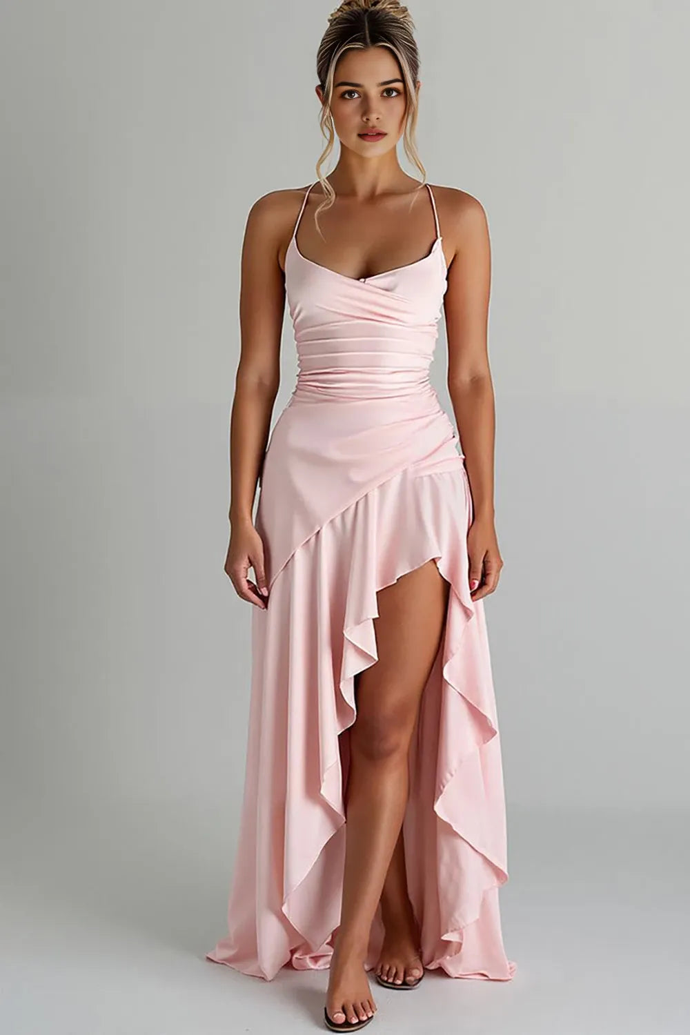 Step into romance with this A line dress. It features a sweetheart neck for a charming look, delicate spaghetti straps for a feminine touch, and a zipper back for a sleek finish. The high low length makes it perfect for evening occasions, ensuring you look graceful and alluring.