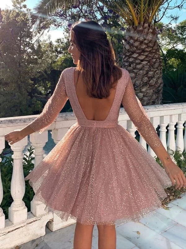 Shiny Long Sleeves Sequins Short Pink Prom Long Sleeves Pink Formal Graduation Party Dresses Homecoming Dresses - US 2 / UK 6 / EU 32